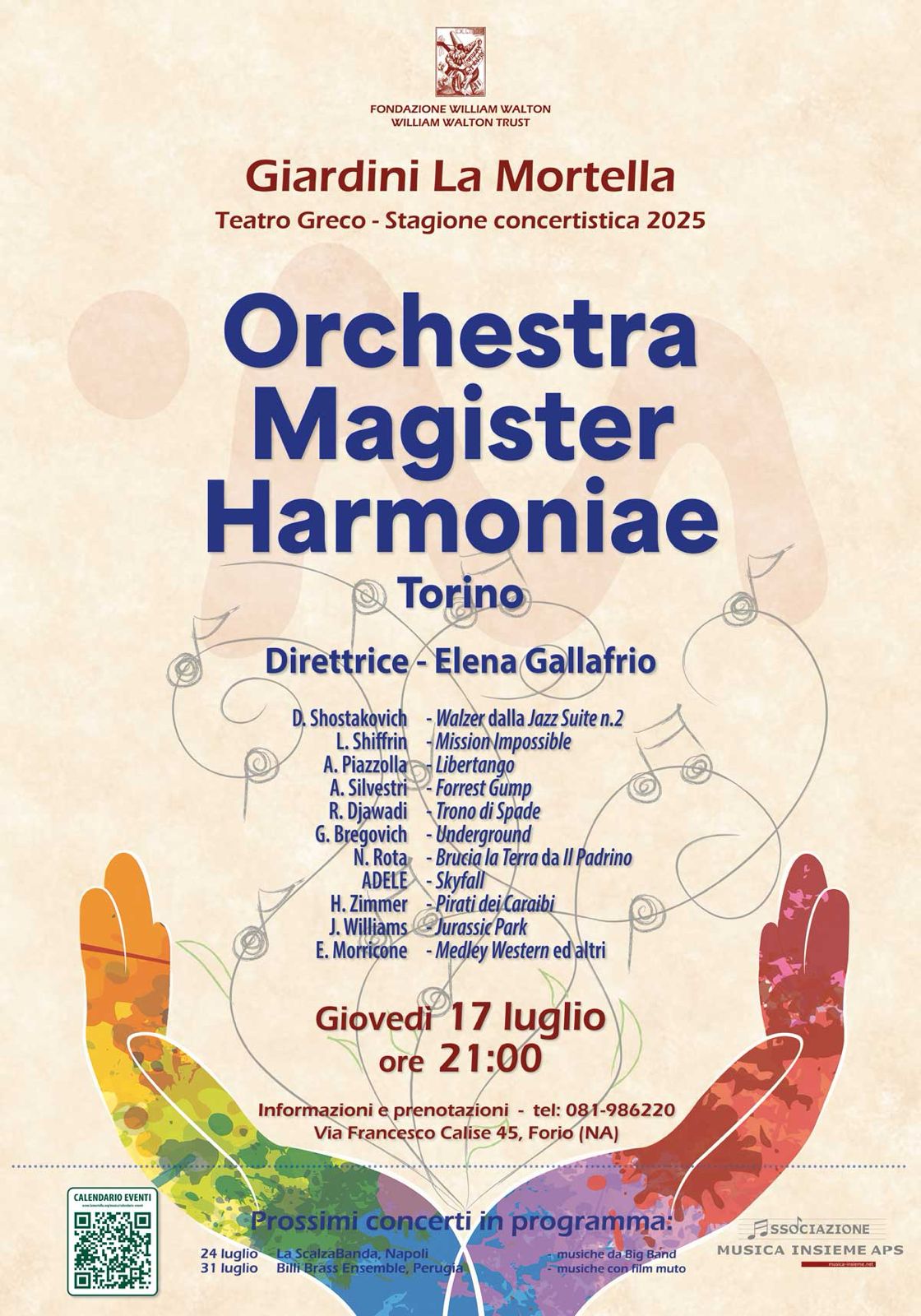 Giovedì 17, al Teatro Greco dei Giardini La Mortella sull'isola d'Ischia, sarà protagonista l'Orchestra Harmoniae di Grugliasco (TO), diretta da Elena Gallafrio. Il programma prevede l'esecuzione di colonne sonore di famosi film, con un omaggio anche a Ennio Morricone.
